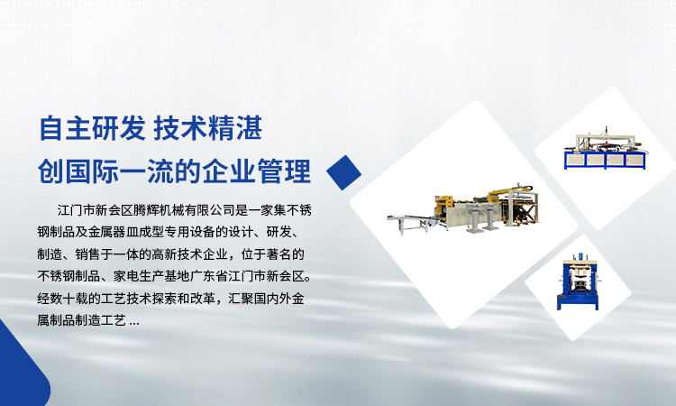 江門(mén)市新會(huì)區(qū)騰輝機(jī)械有限公司是一家集不銹鋼制品及金屬器皿成型專(zhuān)用設(shè)備的設(shè)計(jì)、研發(fā)、制造、銷(xiāo)售于一體的高新技術(shù)企業(yè),位于著名的不銹鋼制品、家電生產(chǎn)基地廣東省江門(mén)市新會(huì)區(qū)。經(jīng)數(shù)十載的工藝技術(shù)探索和改革,匯聚國(guó)內(nèi)外金屬制品制造工藝。